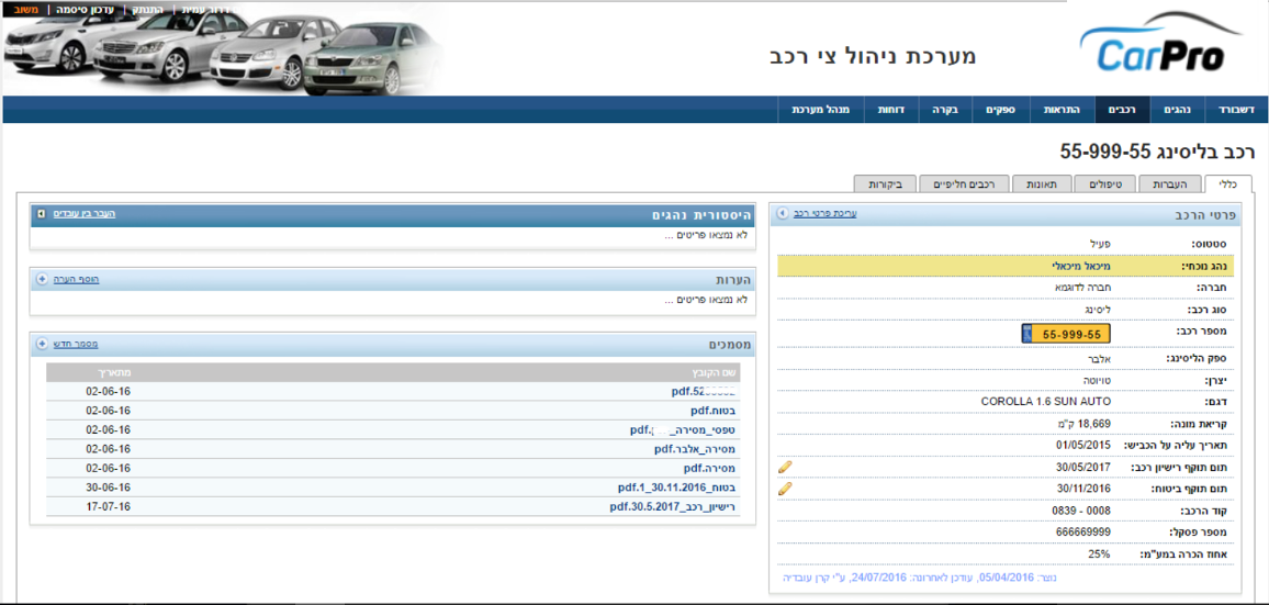 אל תיק הרכב ניתן להגיע בחיפוש מתוך דף רשימת הרכבים או בקליק מתוך דף תיק הנהג.